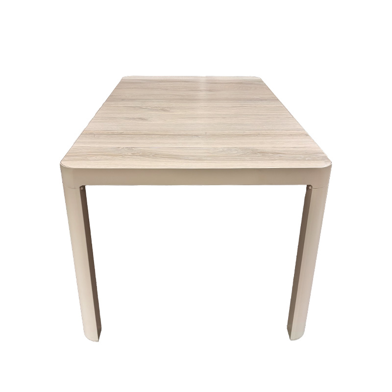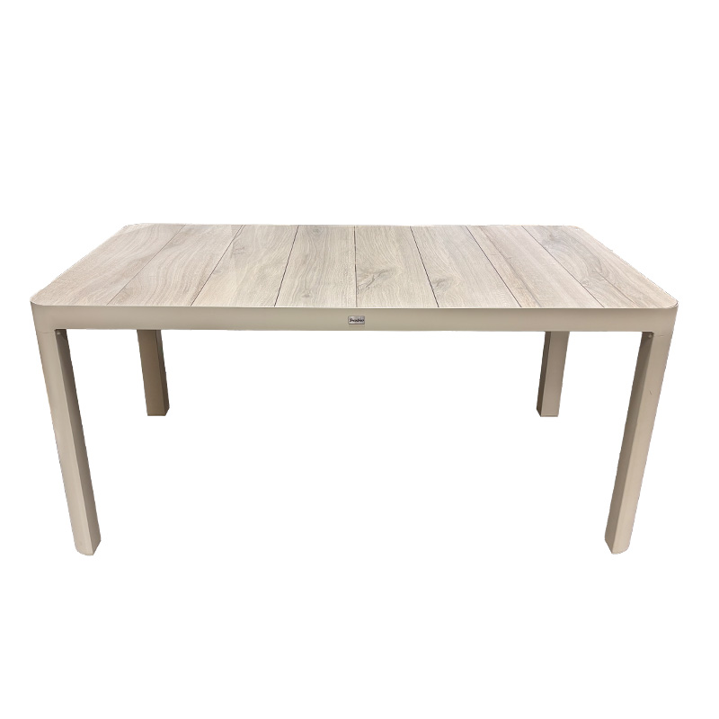 Het tafelblad is gemaakt van keramiek tegels maar heeft de uitstraling van houten planken. Het frame is gemaakt van aluminium. De gebruikte materialen zijn duurzaam, weerbestendig en onderhoudsvriendelijk.
